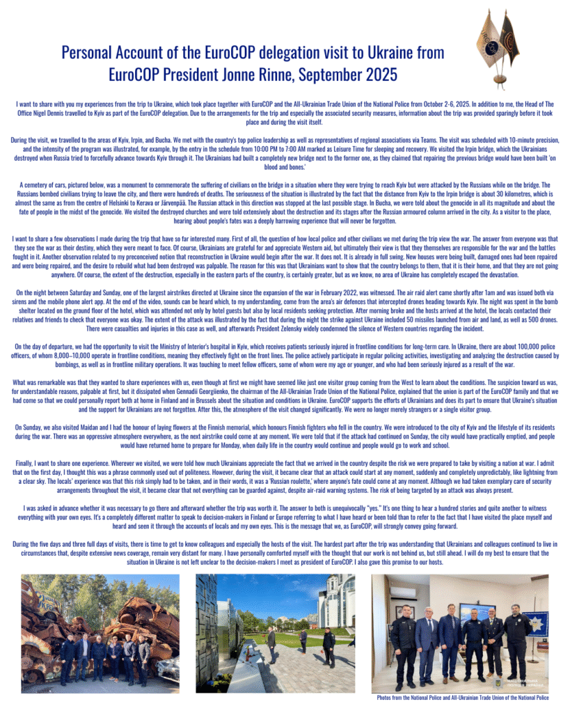 Personal Account of the EuroCOP delegation Visit to Ukraine from EuroCOP President Jonne Rinne, September 2025